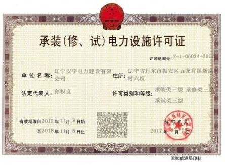 安宇電建獲得地基基礎(chǔ)工程叁級資質(zhì),建筑機電安裝工程承包叁級資質(zhì),輸變電工程承包叁級資質(zhì)及東北能源局叁級承裝,叁級承修,叁級承試資質(zhì)